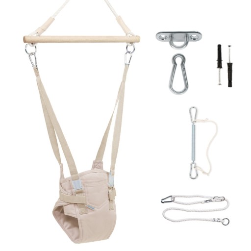 Siedzisko wykonane jest z wytrzymałej bawełny o gramaturze 250 g/m2 i parcianych pasków. Przy produkcji huśtawki wykorzystuje się wyłącznie ekologiczne i nietoksyczne preparaty. Bawełna dobrze przepuszcza powietrze i zapewnia komfort termiczny dziecku. Wszystkie brzegi produktu są zabezpieczone podwójnym przeszyciem - dzięki temu materiał nie obciera delikatnej skóry dziecka i nie niszczy się. Huśtawka podwieszana jest przy pomocy klamry na ramę drzwi. Konstrukcja jest gotowa do montażu na stalowej sprężynie, a sama huśtawka utrzymuje swój kształt dzięki drewnianemu drążkowi. Skoczek lekko podskakuje w rytm ruchów dziecka, zapewniając maluchowi komfort i dobrą zabawę. W zależności od potrzeb i wysokości drzwi można regulować długość huśtawki. Przed pierwszym użyciem należy sprawdzić czy wszystkie elementy zostały poprawnie zamocowane.