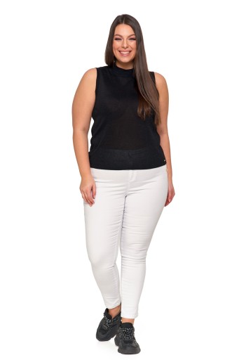 Prezentujemy wyrafinowany top damski sweterkowy, który łączy w sobie nowoczesny design z subtelnym blaskiem, idealny do tworzenia stylizacji z charakterem. Ten bezrękawnikowy model z wygodną stójką jest nie tylko stylowy, ale również niezwykle komfortowy, stanowiąc świetną bazę pod marynarkę lub jako samodzielny element stroju.