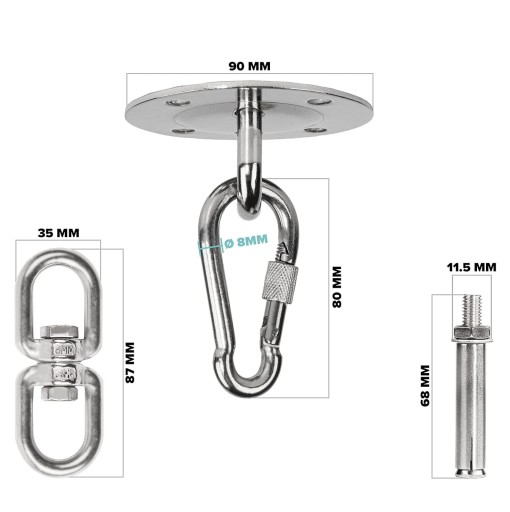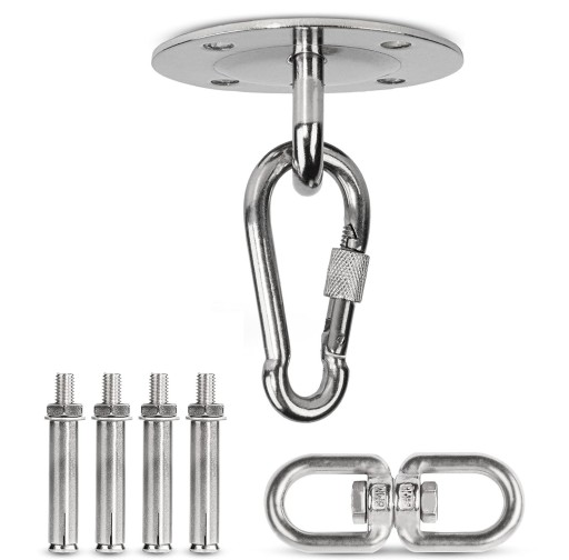👍👍👍 BEZPŁATNY KOMPLETNY ZESTAW - Zestaw do podwieszania sufitowego zawiera 1x płytę, 4x wytrzymałe kotwy M8, 1x karabińczyk, 1x przegub obrotowy 360° i 1x instrukcję. Nie potrzebujesz żadnych innych akcesoriów!