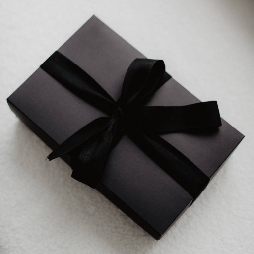 - ozdobne, czarne pudełko przewiązane bawełnianą taśmą.