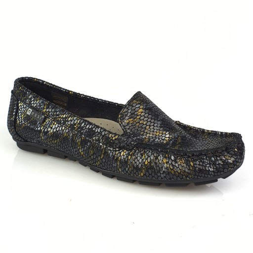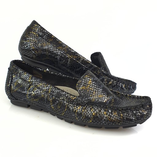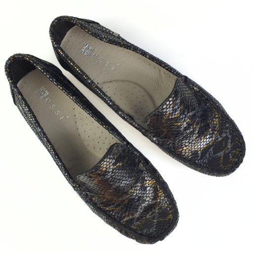 Mokasyny wykonane w całości z wysokogatunkowej skóry licowej w kolorze czarnym z wężowym wzorem.