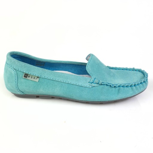 Mokasyny wykonane w całości z wysokogatunkowej skóry zamszowej w kolorze turkusowym.