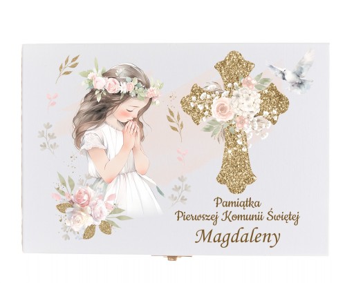 PUDEŁKO PAMIĄTKA PIERWSZA KOMUNIA ŚWIĘTA Z NADRUKIEM I GRAWEREM