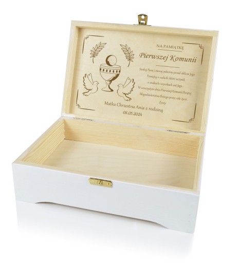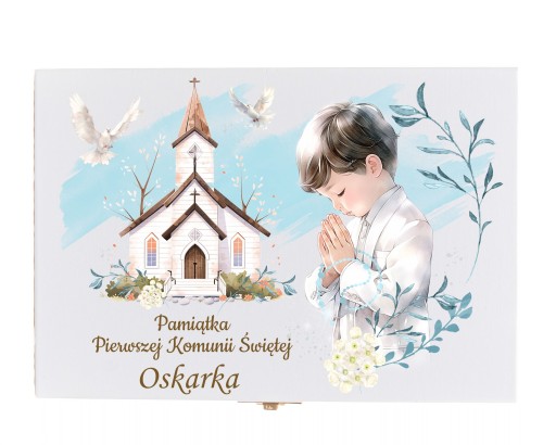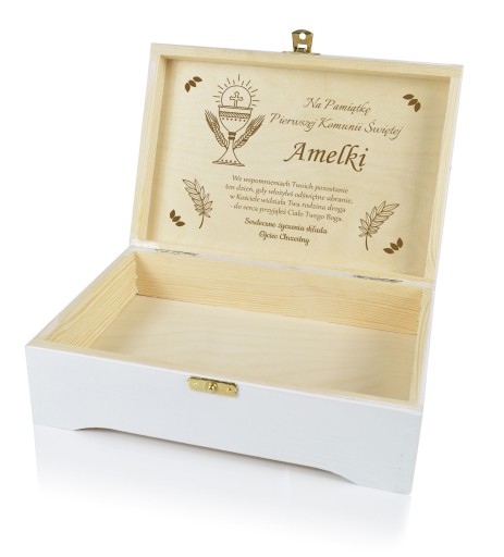 PUDEŁKO PAMIĄTKA PIERWSZA KOMUNIA ŚWIĘTA Z NADRUKIEM I GRAWEREM