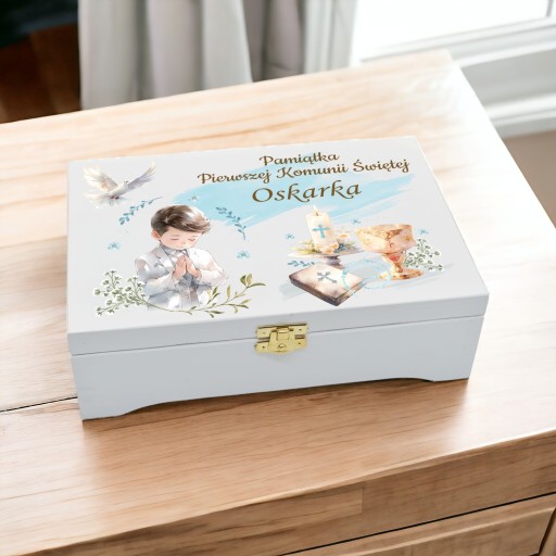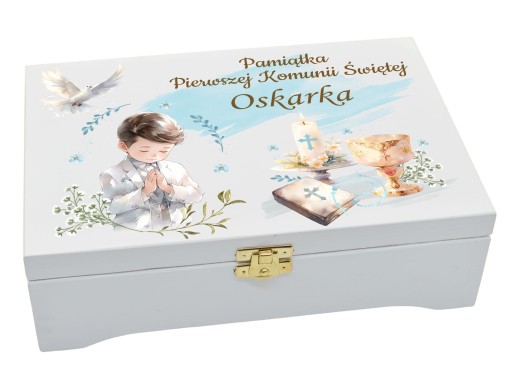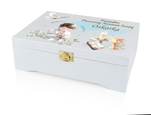 PUDEŁKO PAMIĄTKA PIERWSZA KOMUNIA ŚWIĘTA Z NADRUKIEM I GRAWEREM