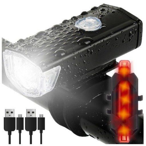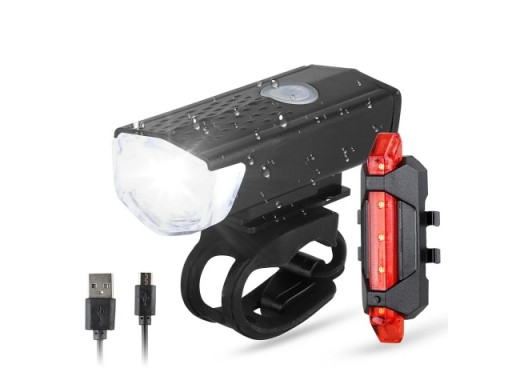 - Zestaw zawiera: 1x Lampka przednia, 1x Lampka tylna, 2x Uchwyt na kierownicę, kabel USB