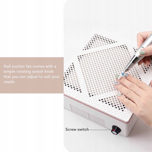 5. REGULOWANA PRĘDKOŚĆ: Wentylator ssący do paznokci jest wyposażony w proste obrotowe pokrętło przełącznika, które można dostosować do własnych potrzeb.