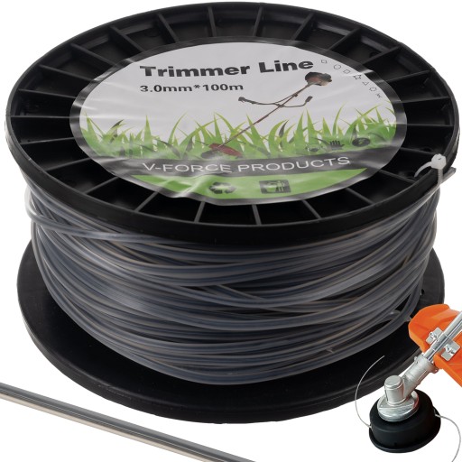 - SPECYFIKACJA - kolor: czarno - przeźroczysty; kształt żyłki: kwadrat; średnica: 3 mm; długość: 100 m; waga:1,096 kg; waga w opakowaniu: 1,100 g.