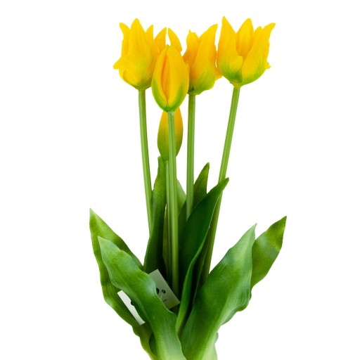 BUKIET TULIPANÓW PAPUZICH - ŻÓŁTE 5szt Cechy produktu: Bukiet ekskluzywnych tulipanów gumowanych związanych rafią. Tulipany są wykonany z najwyższej jakości materiałów. Łodygi i liście kwiatu - zielone. Łodyga wykonana jest z plastycznego tworzywa, dzięki któremu możliwe jest dowolne układanie kwiatów. Wspaniale prezentuje się jako gotowa dekoracja w wazonie ozdabiająca wnętrza np. salonu, restauracji etc. Doskonała dekoracja kompozycji florystycznych i stroików. Piękna i trwała dekoracja. Nie musisz się martwić o podlewanie. Bardzo wysoka jakość. Specyfikacja: wysokość bukietu - ok 40cm ilość tulipanów - 5 sztuk wysokość główki - 5 cm kolor - ŻÓŁTY Cena za 1 bukiet 5 tulipanów. Sztuczny kwiat to bardzo praktyczny wybór z wielu powodów. Przede wszystkim nie trzeba się martwić o jego podlewanie czy przycinanie.Zastosowanie sztucznych roślin i kwiatów w aranżacjach doskonale sprawdza się w sytuacjach, w których chcemy zapewnić sobie zielony akcent w miejscach, gdzie żywe rośliny nie mają najlepszych warunków wzrostu
