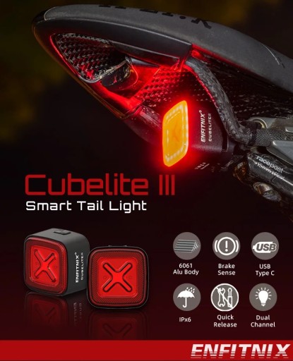 Bardzo lekka, zaawansowana technologicznie tylna lampka LED-owa CUBELITE III, godny następca bardzo popularnego modelu II, 32 bitowy procesor odpowiadający za analizę danych drgań i przeciążeń, akcelerometr, żyroskop, czujnik światła (dostosowuje moc świecenia), czujnik grawitacyjny, czujnik wibracyjny, tryb manualny i automatyczny, wskaźnik słabej baterii, odporność na wodę IPX6, ładowanie przez gniazdo USB-C, od 9 do 30h na jednym ładowaniu, widoczność z 200 metrów. Mocowanie podsiodłowe i na sztyce (dwa mocowania w jednym zestawie).