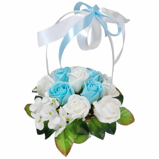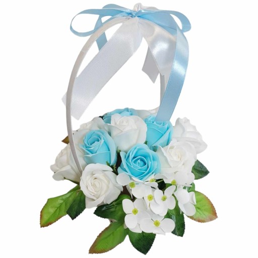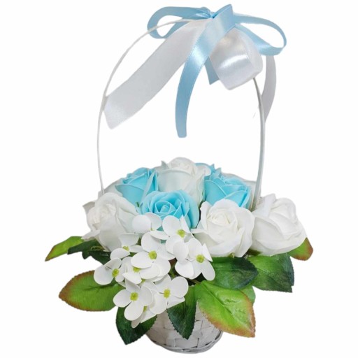 ❤️ Delikatny koszyk z kwiatami mydlanymi w biało-niebieskich odcieniach - idealny na każdą okazję!