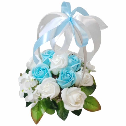 Szukasz wyjątkowego prezentu na chrzest, komunię lub inną uroczystość? Ten uroczy koszyk z kwiatami mydlanymi to doskonały wybór! Delikatne, biało-błękitne kwiaty wykonane z mydła sprawią, że każde wydarzenie nabierze wyjątkowego blasku i elegancji.