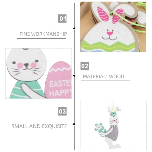 Wykonany z najwyższej jakości materiałów drewnianych wisiorek w kształcie królika jest delikatny i realistyczny. Ładny i realistyczny design sprawia, że bardziej nadaje się do wystroju wielkanocnego. Dzięki wspaniałemu dotykowi dłoni i uroczemu wyglądowi może być używany jako świetny rekwizyt fotograficzny.