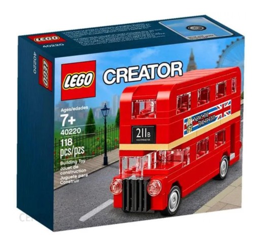 - Ten budowany z klocków LEGO® model London Bus zawiera autentyczne detale, obracające się koła, przezroczyste okienko oraz naklejki na tablicę rejestracyjną, numer trasy, nazwę docelową i banery reklamowe inspirowane modelami LEGO Creator 21013 Big Ben i 10232 Palace Cinema (nie zawarte w zestawie) .