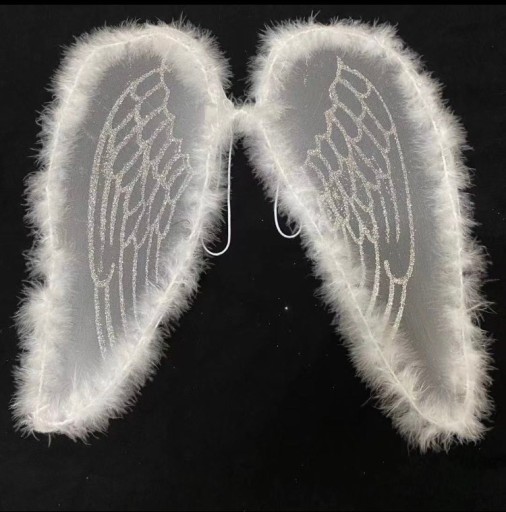 Skrzydła: piękne duże skrzydła, ozdobione srebnym brokatem oraz na obrzeżach puszystymi prawdziwymi piórkami, zakładane w łatwy sposób na gumki, rozmiar uniwersalny