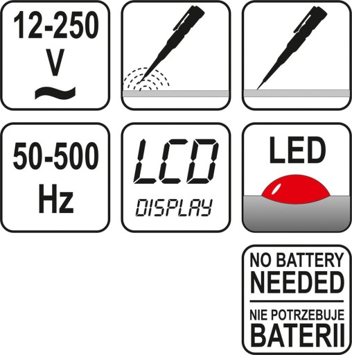 WSKAŹNIK NAPIĘCIA PRÓBNIK 12-250V LCD Z DIODA SZT YATO