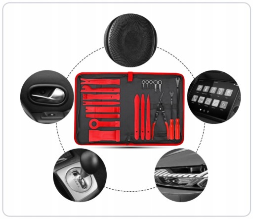 - Specjalistyczny zestaw zawierający ściągacze i klucze do demontażu radia, kostek, listew, spinek, oraz tapicerki w samochodach i urządzeniach technicznych.