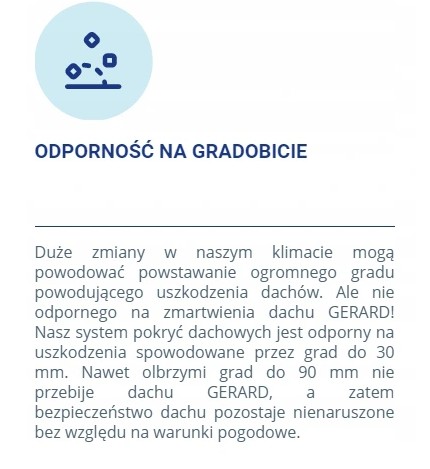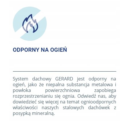 System dachowy GERARD wykonany z całkowicie niepalnych materiałów, blacha i skalna posypka jest w zupełności odporny na ogień. Szczelność pokrycia uniemożliwia przedostawanie się iskier do środka budynku i zaprószenia ognia. Lekkość pokrycia i pewność mocowania w 8 punktach zmniejsza ryzyko zawalenia się dachu podczas pożaru.