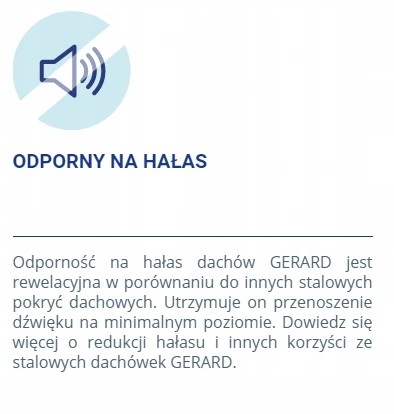 Na tle innych pokryć stalowych dachy GERARD wypadają doskonale pod względem redukcji hałasu. Jego wpływ ograniczonego dzięki zastosowaniu teksturowanej powłoki z posypką wulkaniczną, która doskonale tłumi i minimalizuje przenoszenie dźwięku. Udało nam się opracować system dachowy, który jest odporny, wytrzymały, piękny i dodatkowo doskonale tłumi hałas na przykład podczas deszczu, czy gradu.