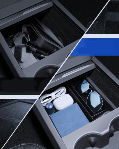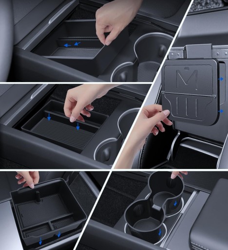 Zestaw zawiera organizer na konsolę środkową, silikonową tacę organizerową, pudełko do przechowywania podłokietników, ukryte pudełko i uchwyt na napoje. Kompletny zestaw 5 sztuk pomoże Ci lepiej zorganizować Teslę.