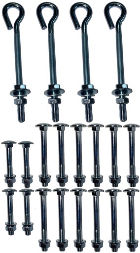 Siedzisko huśtawki można mocować na kilka sposobów. Najprostszy i najpopularniejszy to zastosowanie 4szt śrub z uchem jak na zdjęciu obok - śrubę przepuszcza się przez deskę i stelaż siedziska.