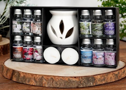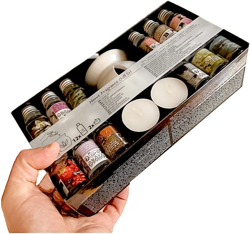 Prezentowe opakowanie 23,5 x 12,5 x 7,5 cm zawierające 12 olejków zapachowych wraz z ceramicznym kominkiem i 2 świeczki o średnicy 4cm tealight.