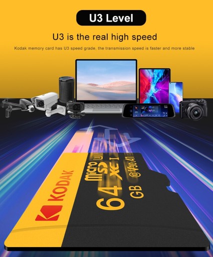 Produkt spełni oczekiwania użytkowników, którym zależy na możliwości rejestrowania dużej ilości nagrań w wysokiej jakości. Dostępne pojemności 32, 64, 128GB pozwalają na przechowywanie wielu plików, na przykład na telefonie czy tablecie. Karta pamięci KODAK microSDXC z powodzeniem pomieści nagrania w najwyższej jakości. Świetnie sprawdzi się między innymi przy rejestrowaniu plików wideo w Full HD, na których można dostrzec najdrobniejsze detale.