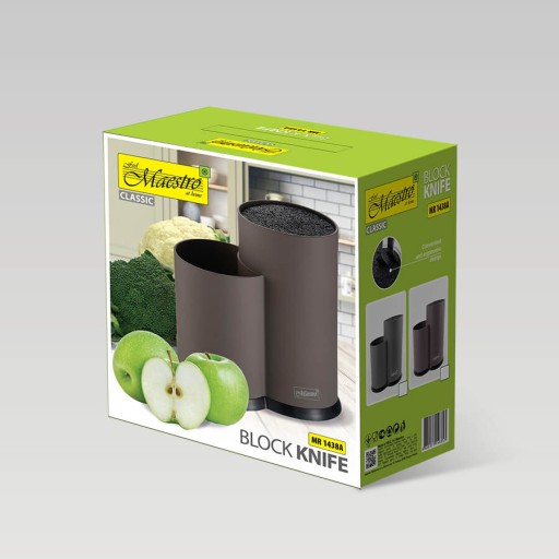 Blok został wykonany z trwałego polipropylenu, który zapewnia nie tylko wytrzymałość, ale także higieniczne warunki przechowywania. Wnętrze bloku jest wypełnione pręcikami, które stabilizują noże i chronią ich ostrza przed ewentualnymi uszkodzeniami.