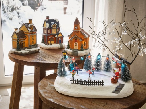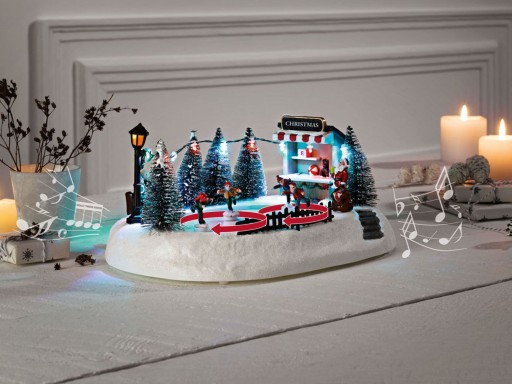 Ta urocza wioska świąteczna LED o wymiarach ok. 29 x 21 x 13,5 cm to idealna dekoracja do użytku w pomieszczeniach. Zawiera ona scenę otoczenia z ruchomymi łyżwiarzami, które dodają uroku i dynamiki całej scenie. Aż 11 energooszczędnych, trwałych diod LED z kolorowym światłem dodaje blasku i wyjątkowego uroku całej dekoracji.