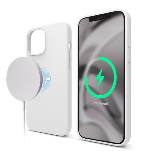 W wewnętrznej części etui zaprojektowano mocne magnesy, które zapewniają dobre przyleganie telefonu do ładowarki MagSafe i innych akcesoriów.Wykonane z płynnego silikonu, zapewnia przyczepność i ochronę.Zdjęcie poglądowe.Opakowanie uszkodzone.