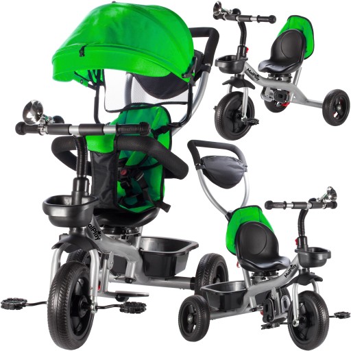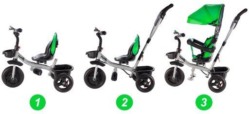 - Jako wózek spacerowy (rowerek z pełnym wyposażeniem): poręcze zabezpieczają dziecko, budka osłania przed słońcem, opiekun za pomocą rączki prowadzi i steruje rowerkiem. Siedzisko można obrócić przodem lub tyłem do kierunku jazdy, w zależności od preferencji malucha i rodzica.