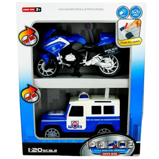 Masz w domu małego bohatera, który pragnie ratować świat? Mamy coś specjalnego! Przedstawiamy zestaw dwóch pojazdów ratowniczych. Komplet będzie idealny do zabawy z przyjaciółmi, ponieważ składa się z motoru policyjnego, za pomocą którego, mały komisarz będzie gonił złodziei, a w międzyczasie drugi maluch jako policjant, będzie pędził swoim autem na akcje ratunkową! Dzieci, mogą bawić się do woli i wymyślać niestworzone historie, by jeszcze bardziej urozmaicić zabawę!