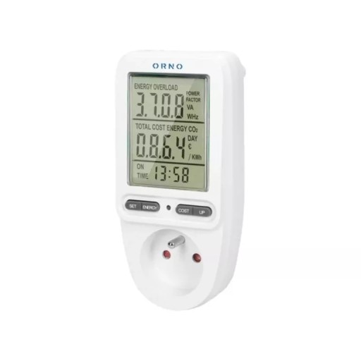Watomierz firmy ORNO to idealne urządzenie do pomiaru zużycia prądu elektrycznego a przy tym obliczenia kosztów podłączonego urządzenia. Często nie mamy pojęcia jakie urządzenia gospodarstwa domowego pobierają najwięcej energii a tym samym generują największe rachunki. Rozwiązaniem tego problemu jest zakup watomierza który jest w stanie sprawdzić stan zużycia energii zarówno w domu czy też w firmie. Zaletą prezentowanego czarnego kalkulatora energii elektrycznej jest łatwa obsługa oraz duży czytelny wyświetlacz LCD, dzięki czemu urządzenie będzie również doskonałym rozwiązaniem dla osób starszych. Model dostępny również w czarnej wersji. Duży wyświetlacz LCD pokazuje dodatkowo: napięcie sieci, prąd w obwodzie, częstotliwość prądu, współczynnik mocy POWER FACTOR, moc podłączonego obciążenia, całkowite zużycie energii kWh, koszt zużytej energii, programowalną cenę 1kWh, łączny czas pomiaru zużycia energii od 0 sek. do 9999 dni, uśrednioną wagę emisji CO2 przy wytworzeniu energii pobranej. Pomiar napięcia: 150V~ 276V~