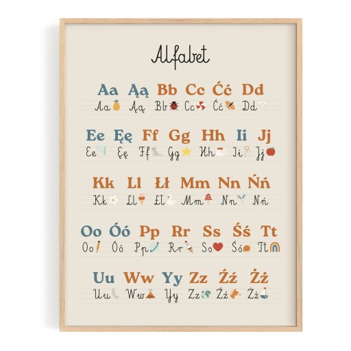 Nasz plakat z alfabetem to piękna, kolorowa grafika, która nie tylko udekoruje dziecięcy kącik, ale także zachęci do poznawania liter od najmłodszych lat. Urocze dziecięce pismo z wyróżnionymi osobnymi kolorami głoskami i spółgłoskami, w połączeniu z odpowiednio dopasowanymi ilustracjami oraz podpisami - to doskonały początek przygody Twojego dziecka z nauką pisania i czytania!