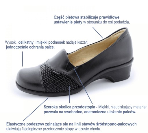 Obuwie dzięki zastosowaniu najwyższej jakości materiałów oraz podwyższonej tęgości kopyta posiada obszerne, miękkie i bez uciskowe wnętrze przyjazne stopom wrażliwym.