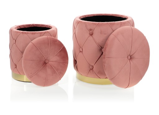 PRZEDMIOTEM DZISIEJSZEJ PREZENTACJI JEST EKSKLUZYWNY KOMPLET DWÓCH PUF Z POJEMNIKAMI Z NASZEJ NAJNOWSZEJ KOLEKCJI MILENA. Obie pufy wykonane zostały w ponadczasowym stylu glamour. Wykorzystany przy ich wykończeniu wysokiej jakości materiał welurowy w kolorze różowym, cechuje się pięknym połyskiem oraz nasyceniem koloru.