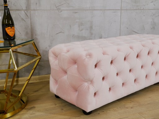 Prezentowany przedmiot wykonany został z weluru w kolorze jasnoróżowym, pikowanego, bardzo przyjemnego w dotyku. Korpus oferowanej ławki wykonany został z wysokogatunkowej płyty MDF. W spodzie ławki zamontowane są 4 drewniane nóżki.