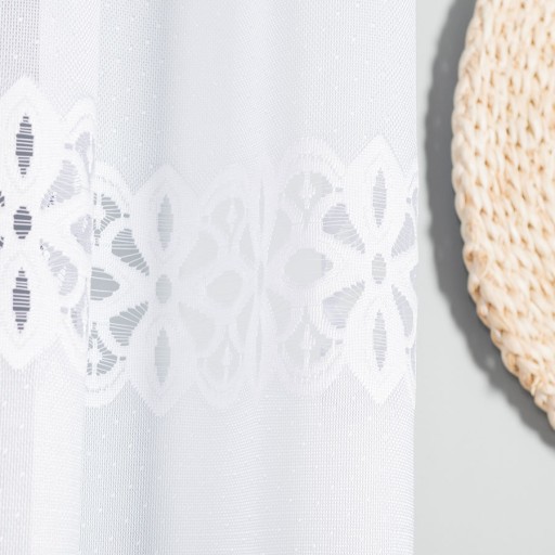 Piękna firana żakardowa o wys. 180 cm. Posiada piękną biel i grube, szerokie pasy zdobień. Wykonana z wysokiej jakości przędzy żakardowej o dużej gramaturze . Gruby estetyczny wzór stanowi efektowną aranżację okna. Firana prezentuje się najlepiej namarszczona w zakresie 1:2. Po praniu nie wymaga prasowania