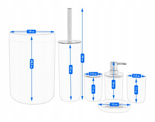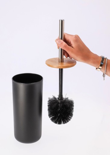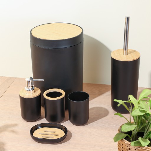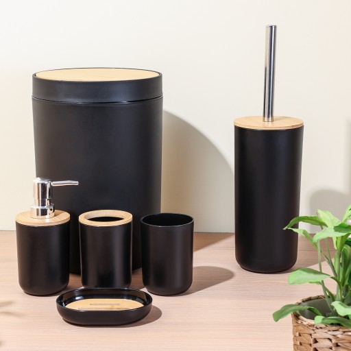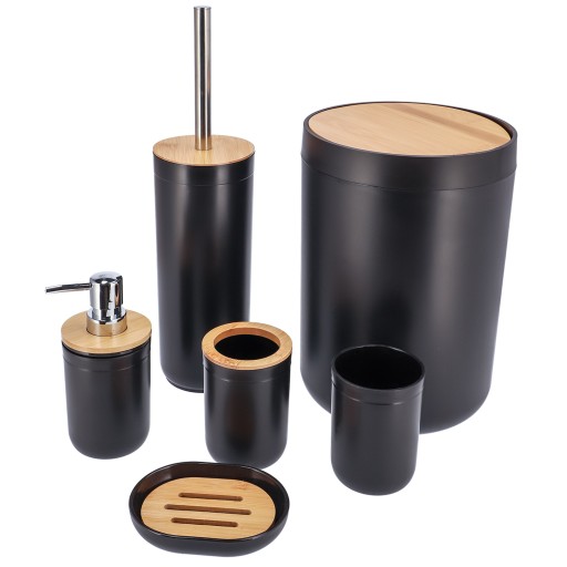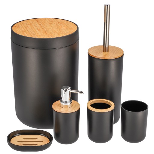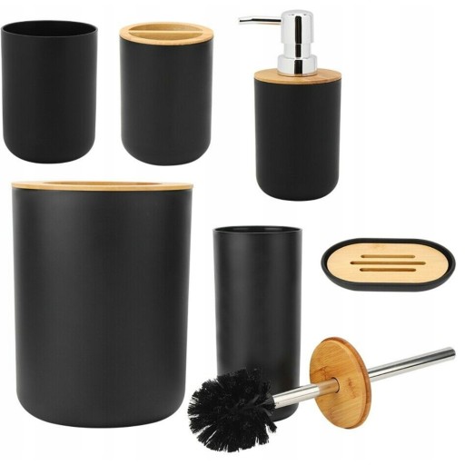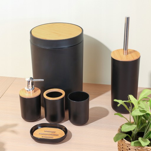 Zestaw łazienkowy składa się z 6 elementów o eleganckim designie w kolorze czarnym z drewnianymi akcentami. Ten stylowy zestaw dodatków gwarantuje spójny wygląd i funkcjonalność każdej przestrzeni łazienkowej przez długie lata.