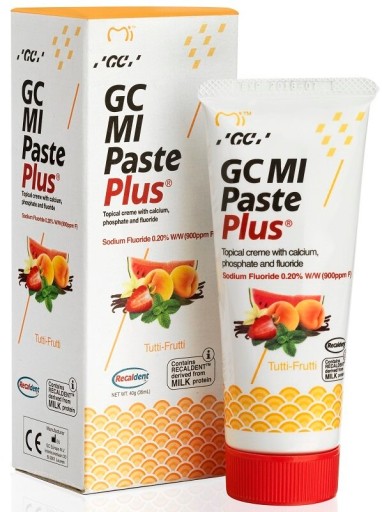 GC MI Paste Plus to oparta na wodzie, bezcukrowa pasta do zębów do miejscowego stosowania, zawierająca bioaktywny wapń, fosforany i fluor. Za skuteczność odpowiada specjalny, opatentowany kompleks Recaldent™, z wbudowanym fluorem CPP-ACPF (fosfopeptyd kazeiny – amorficzny fosforan wapnia z fluorem). Poziom fluoru wynosi 0,2% w/w (900ppm), czyli tyle, ile średnio zawierają pasty do zębów dla dorosłych.