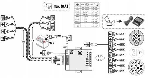 Moduł został zaprojektowany do podłączenia 8-przewodowej instalacji przyczepy (czyli ze światłem wstecznym) i powinien być użyty z gniazdem 13-pinowym ale może być użyty z gniazdem 7-pinowym (wówczas bez obsługi światła wstecznego).