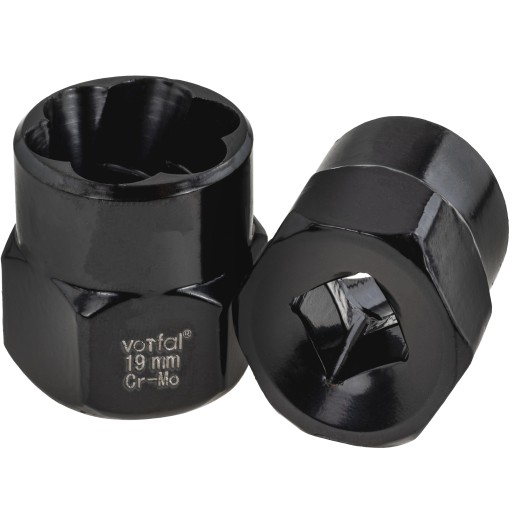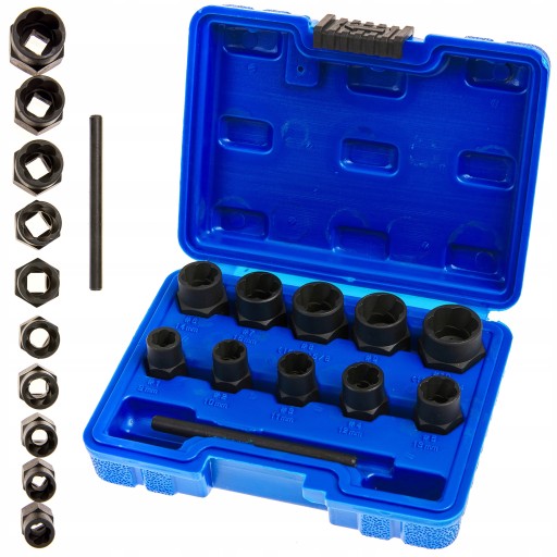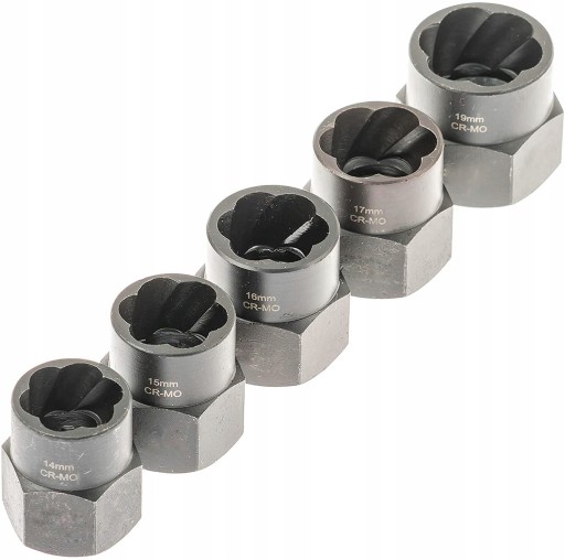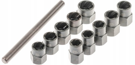 Zestaw specjalistycznych nasadek do wykręcania obrobionych śrub, nakrętek itp. Specjalny kształt wewnątrz nasadki, umożliwia wgryzienie się w główkę obrobionej śruby lub nakrętki w celu zakleszczenia się. Zewnętrzna budowa nasadki umożliwia użycie klucza płasko-oczkowego lub nasadki 6-kąt. Biorąc pod uwagę, precyzję wykonania pracy odkręcenia obrobionej śruby lub nakrętki, nie należy stosować do tych operacji klucza udarowego.