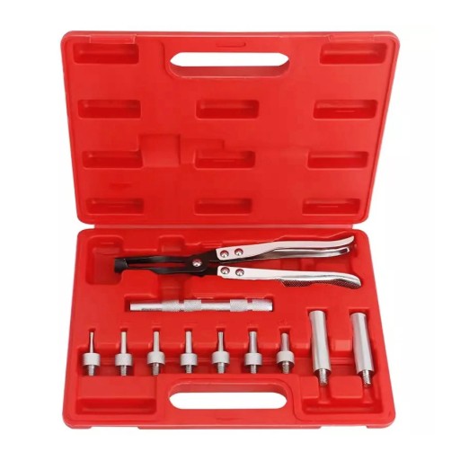 Zestaw zawiera specjalistyczne szczypce wraz z zestawem złączek dopasowanych do wszystkich typowych modeli zaworów.