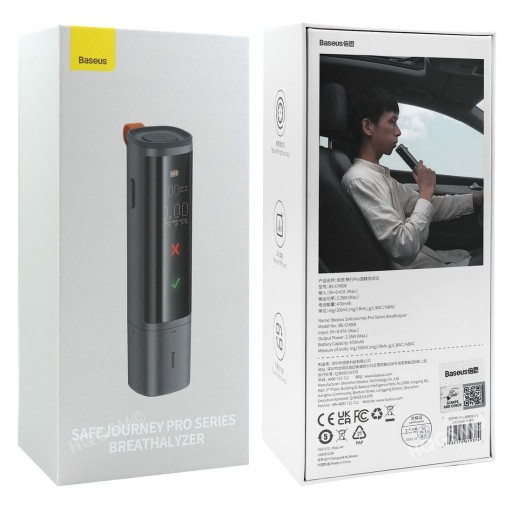 Niewielki cyfrowy alkomat firmy Baseus do pomiaru stężenia alkoholu w wydychanym powietrzu. Zaawansowany czujnik elektrochemiczny mierzy zawartość alkoholu a wynik wyświetlany jest w ciągu 3 sekund.