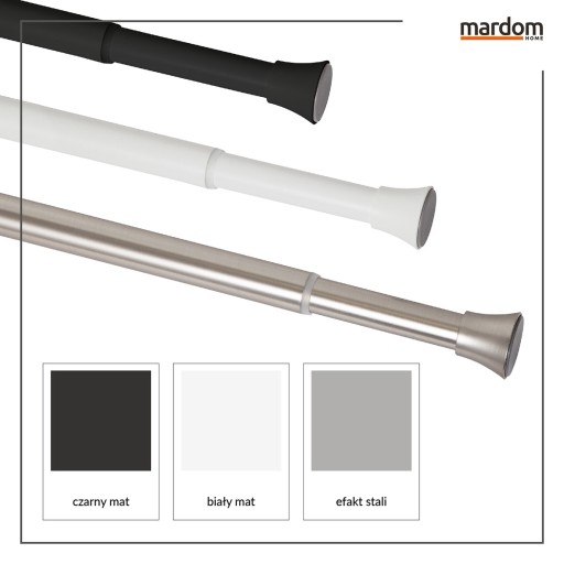 Drążek teleskopowy posiada minimalistyczną formę wzorniczą i bazowe, neutralne kolory, stąd dopasuje się do każdego wnętrza bez względu na jego charakter.