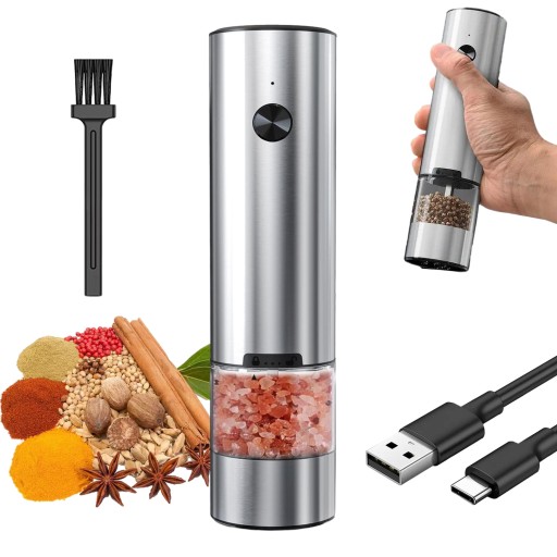 Elektryczny młynek do soli i pieprzu z możliwością ładowania wykonany jest z wysokiej jakości stali nierdzewnej 304. Ładowanie TYPE-C, centralna pozycja napełniania przypraw i ceramiczny rdzeń zapewniają gładkie i łatwe mielenie za jednym naciśnięciem przycisku. Automatyczny młynek do pieprzu możesz naładować w dowolnym momencie za pomocą ładowania TYPE-C, bez konieczności zakupu dodatkowych akumulatorów.