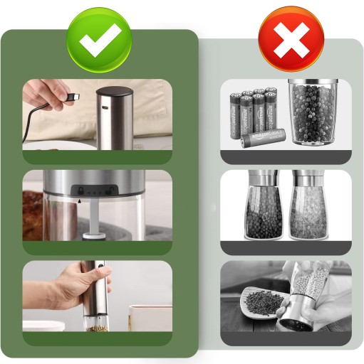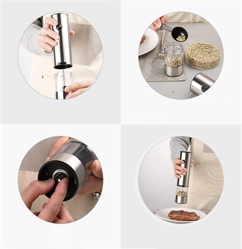Automatyczny młynek do soli i pieprzu nie wymaga skręcania. Naciśnij i przytrzymaj przycisk, otrzymasz świeżą sól i pieprz lub inną przyprawę w proszku. Uwolnij ręce i podczas szlifowania możesz zająć się innymi zadaniami kuchennymi. Niezależna konstrukcja komory baterii nie pozwala na przedostawanie się soli i pieprzu do środka, co może skutecznie wydłużyć żywotność młynka.