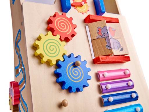 Kolorowe elementy przyciagają wzrok i małe rączki kolorami. Jednocześnie, dzięki neutralnej, drewnianej bazie, zabawka nie dostarcza dziecku nadmiaru bodźców.