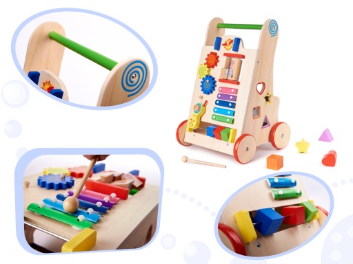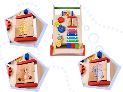 PCHACZ CHODZIK DREWNIANY KOSTKA EDUKACYJNA 6W1Chodzik, który ułatwi Twojemu maluchowi stawianie pierwszych kroków. Sprawdzi się też w późniejszym wieku jako wózek dla ulubionych zabawek oraz pierwsze liczydło.Spacer z pchaczem pomaga maluchowi utrzymać równowagę podczas nauki chodzenia. Wspomaga rozwój zdolności manualnych oraz rozwija motorykę całego ciała. Chodzik zachęci malucha do aktywności fizycznej.Nasz chodzik jest stabilnym wsparciem dla malucha, który uczy się chodzić. Dziecku nie uda się go przewrócić. Drewniane koła zabezpieczono antypoślizgową warstwą gumy.Cieszy funkcjonalnością i cieszy oko. Estetyczna konstrukcja, wyraziste kolory, dbałość o detale - to ładny i bezpieczny towarzysz dla Twojego dziecka. Ten pchacz spodoba się rodzicom, którzy poszukują ekologicznychakcesoriów dla swojego malucha. Drewniane zabawki to świetny wybór!