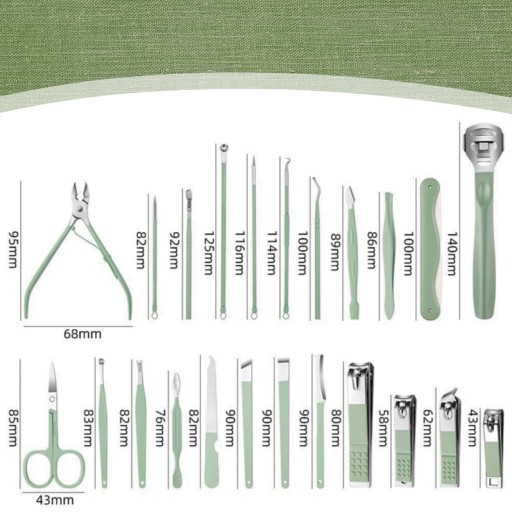 Zestaw narzędzi do manicure został wykonany z wytrzymałej stali wolframowej. Cechuje się hipoalergicznością oraz dużą odpornością na ścieraniei tępnienie. Niezwykle praktyczny zestaw do paznokci został wyposażony w 22 elementów takich jak nożyczki, obcinacze, cążki, pilniki, radełka. Całość została zapakowana w estetyczne, zamynane, poręczne etui ułatwiając przenoszenie i przechowywanie zestawu.